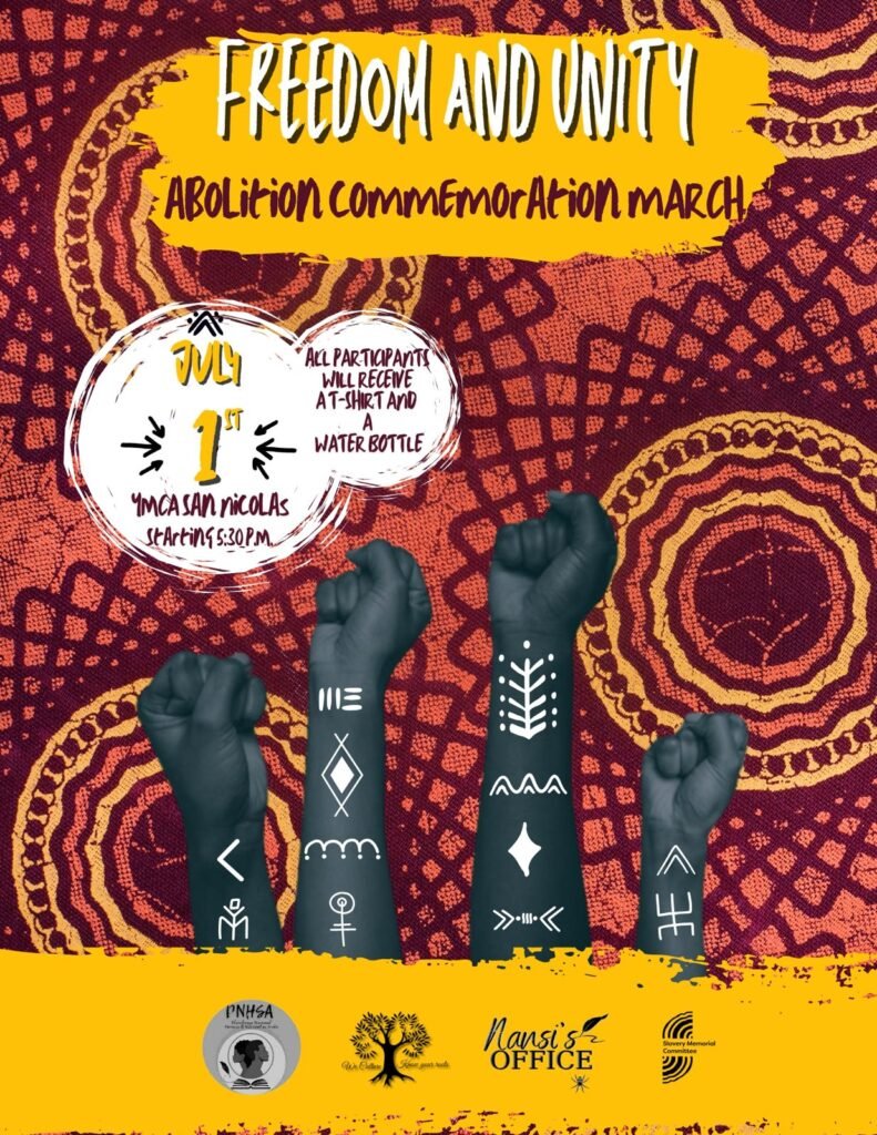 Join us on July 1st in San Nicolas for a powerful day of remembrance, culture, and celebration as we honor the abolition of slavery and the enduring spirit of unity. The day kicks off at 5:30 PM at the YMCA San Nicolas with a commemorative march, where all participants will receive a free t-shirt and water bottle.